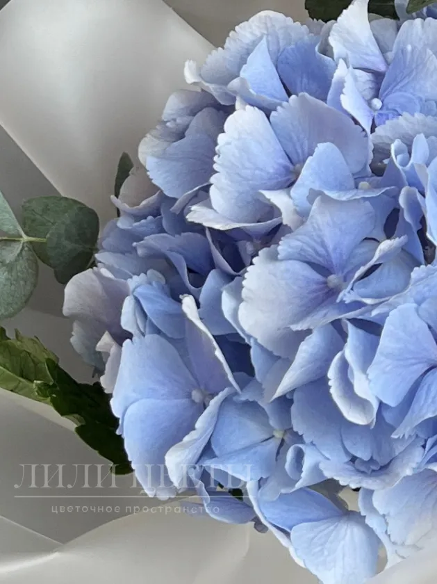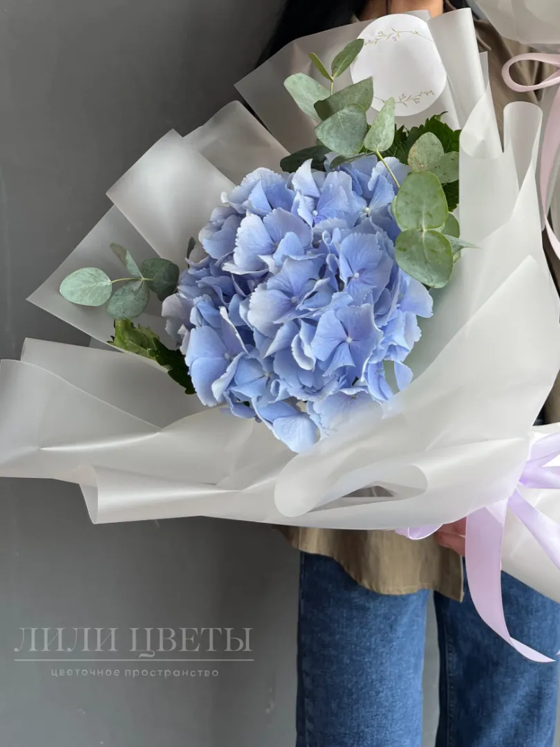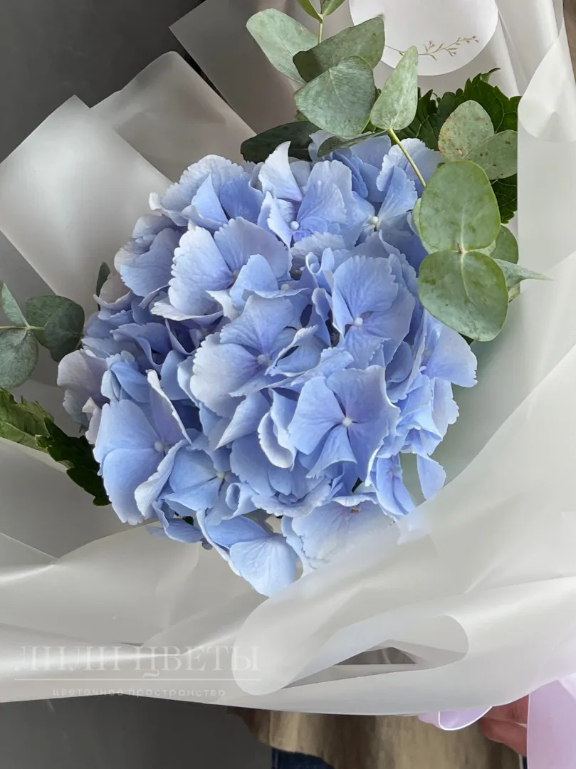 Монобукет из нежной голубой гортензии, дополненной зеленью эвкалипта, создает впечатление легкости и свежести.
