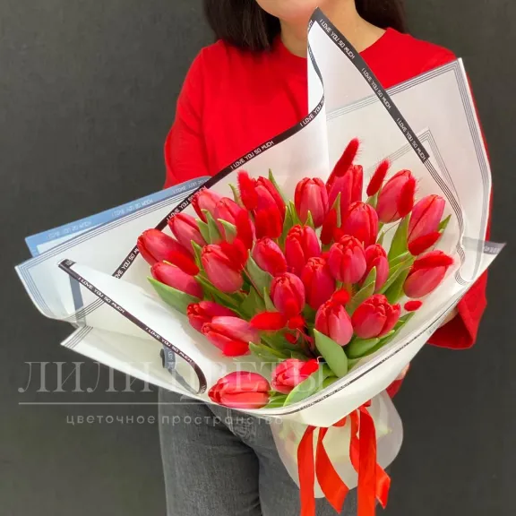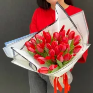 Монобукет из красных тюльпанов - яркий и страстный, он олицетворяет любовь, романтику и стойкость чувств.