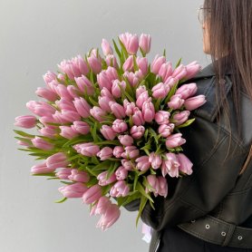 Монобукет состоит из нежных розовых тюльпанов, которые символизируют любовь, нежность и деликатность.