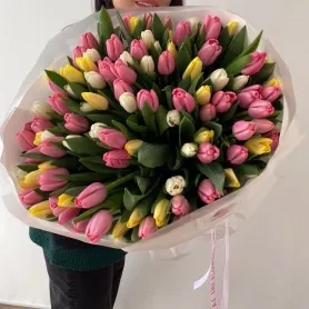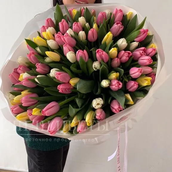 Монобукет тюльпанов излучает нежность и чистоту, благодаря сочетанию белых, жёлтых и розовых цветов.
