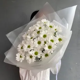 Монобукет из белых кустовых хризантем - это изысканная и элегантная композиция, состоящая из пышных белых цветов, расцветающих в форме кустиков.