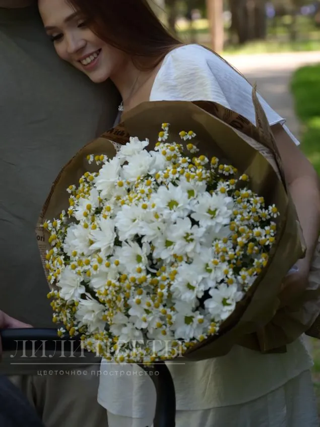 Этот красивый букет включает в себя изысканные кустовые хризантемы и нежные панацетумы, создавая идеальное сочетание ярких и пастельных оттенков.