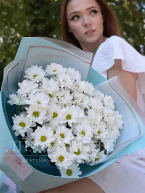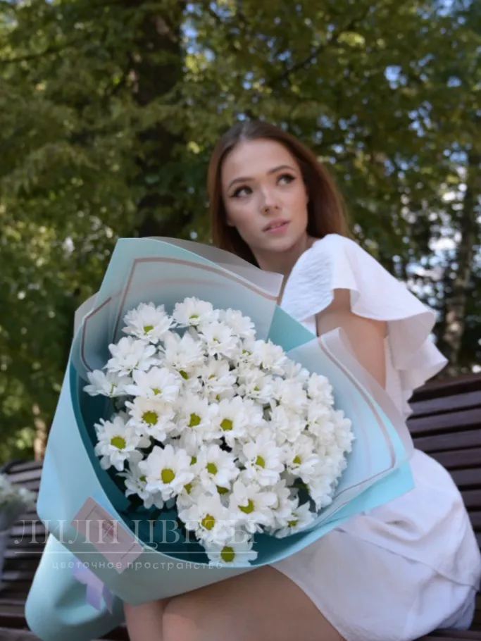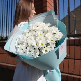 Этот изящный букет состоит из кустовых хризантем в нежном голубом оттенке.
