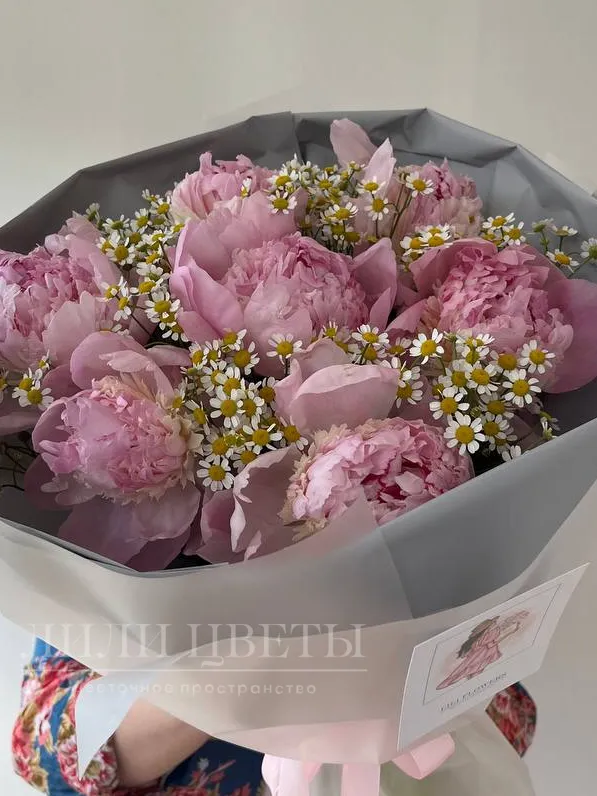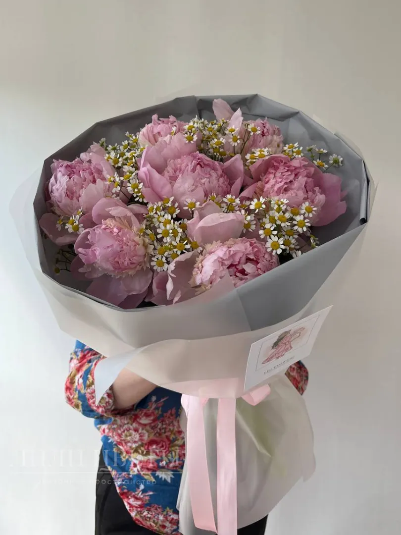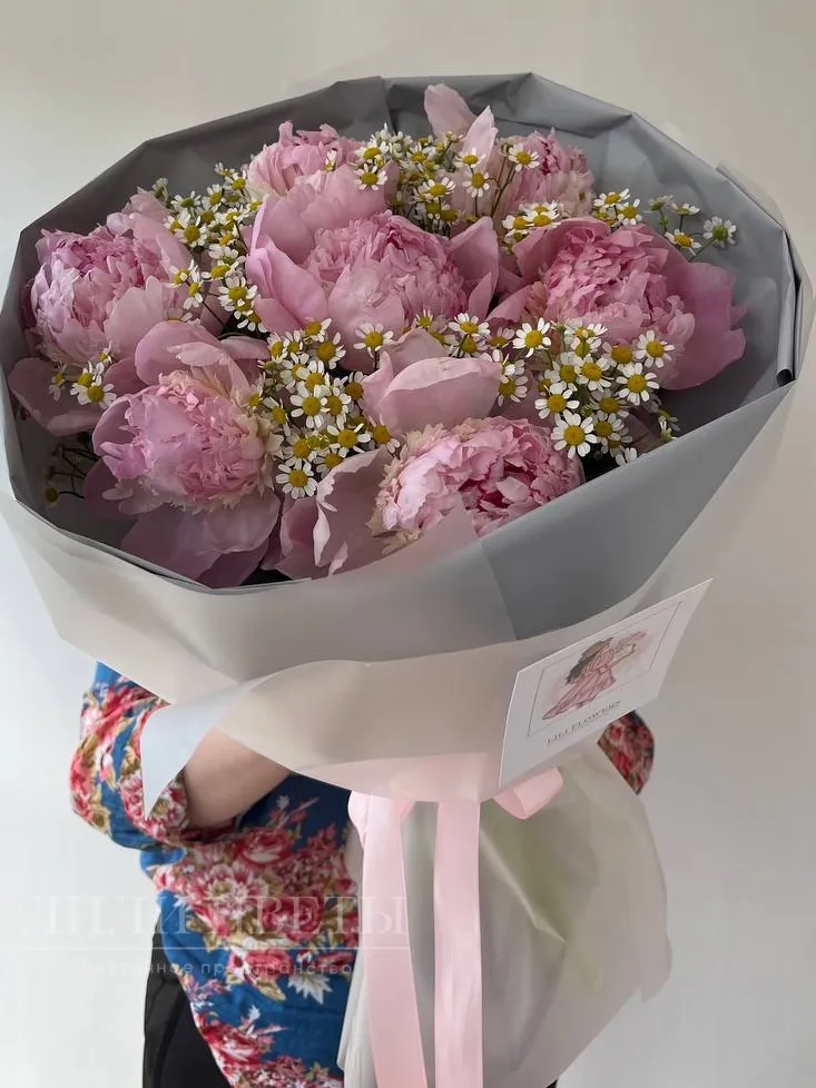 Букет с пионами и полевой ромашкой