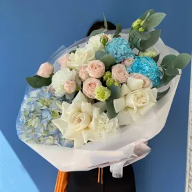 Воздушный букет с гортензией,кустовой розой, гвоздикой, ажурной розой и эвкалиптом
