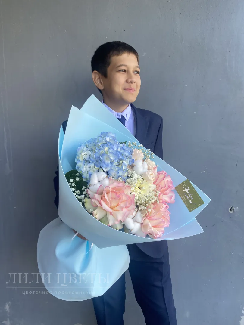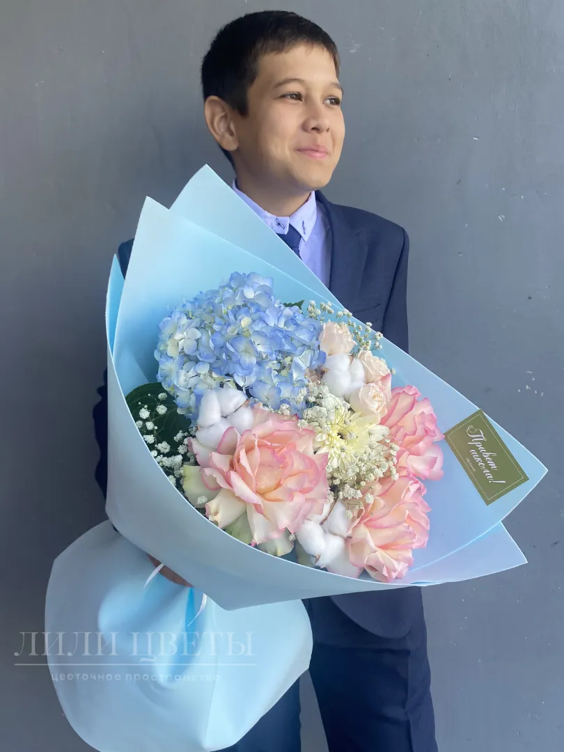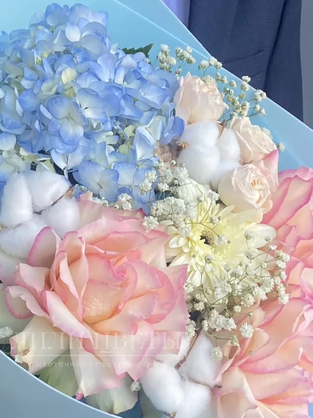 На фото – восхитительный сборный букет, где изящные ажурные розы, пышные гортензии, нежные гипсофилы, яркие герберы и кустовые розы гармонично сочетаются с хлопком, создавая неповторимую композицию. Этот букет, словно солнечный лучик, привносит в атмосферу радость и позитивные эмоции.