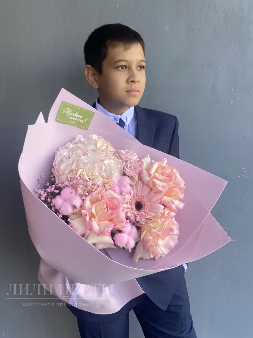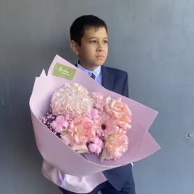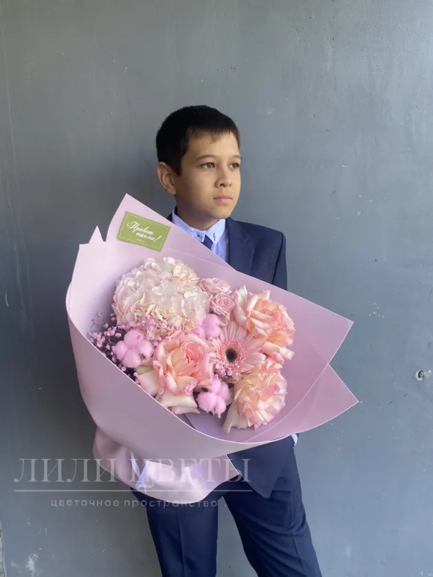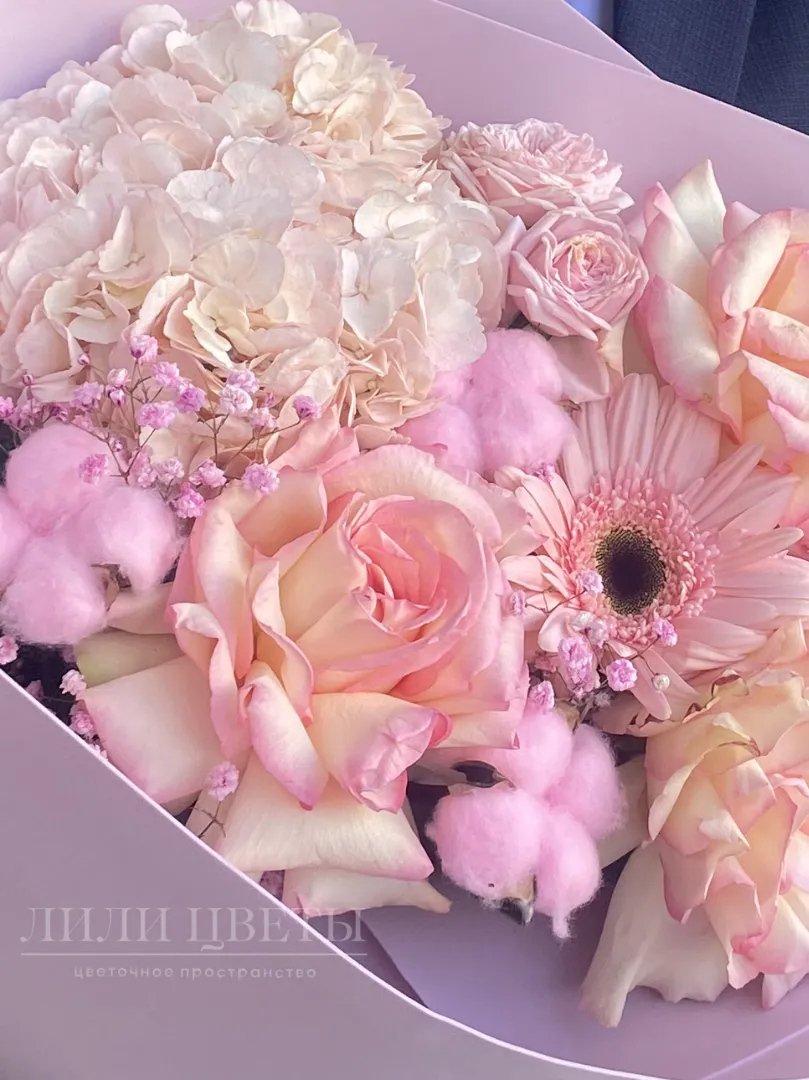На фото – нежный и романтичный букет, собранный из цветов в пастельных розовых оттенках. Ажурные розы, гортензии, гипсофилы, герберы, кустовые розы и хлопчатник создают воздушную композицию, пронизанную легкостью и очарованием.