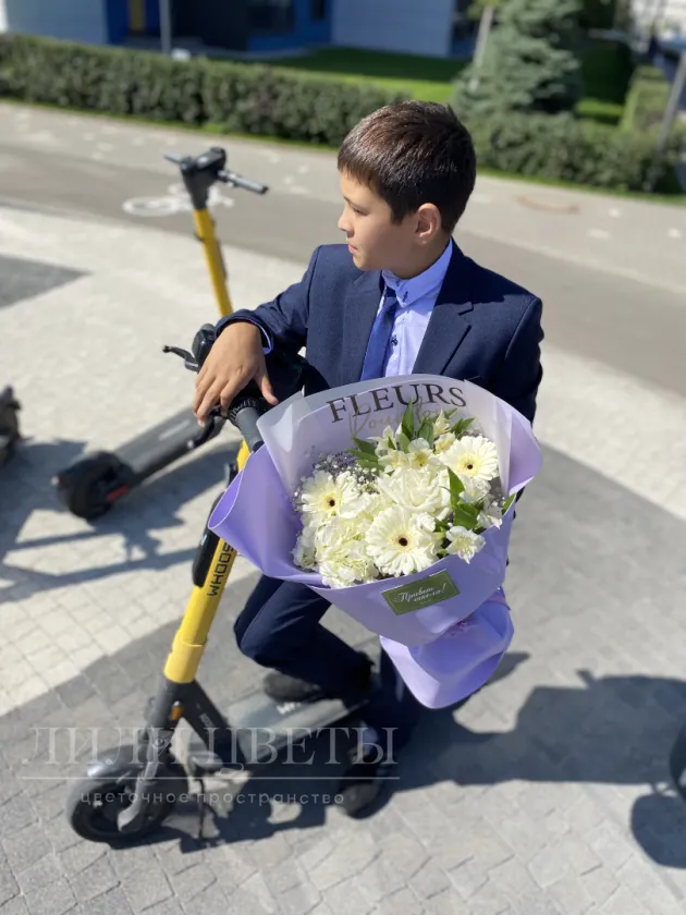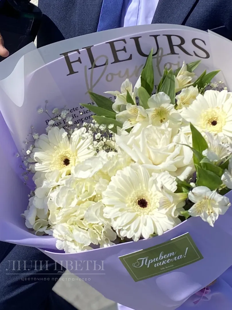 На фото — яркий и жизнерадостный сборный букет, состоящий из молочных гербер, гортензии, ажурной розы, альстромерии и гипсофилы. Разнообразие форм и оттенков цветов создает неповторимую композицию, которая излучает свежесть, легкость и позитив.