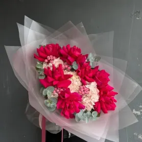Сборный букет из малиновых роз, гортензии, эвкалипта