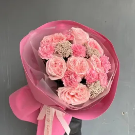 Сборный букет из пионовидных роз, диантусов и озотамнуса