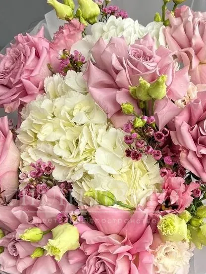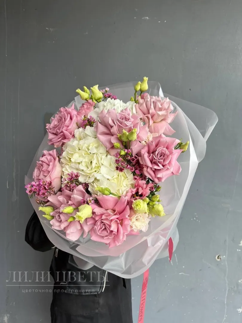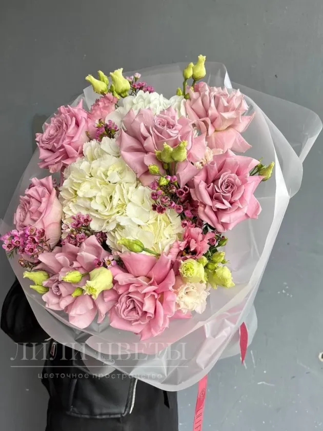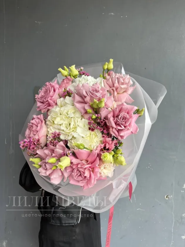 Сборный букет с ажурными розами, гортензией