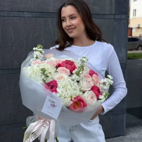 Сборный букет с пионами, маттиолой, пионовидной розой