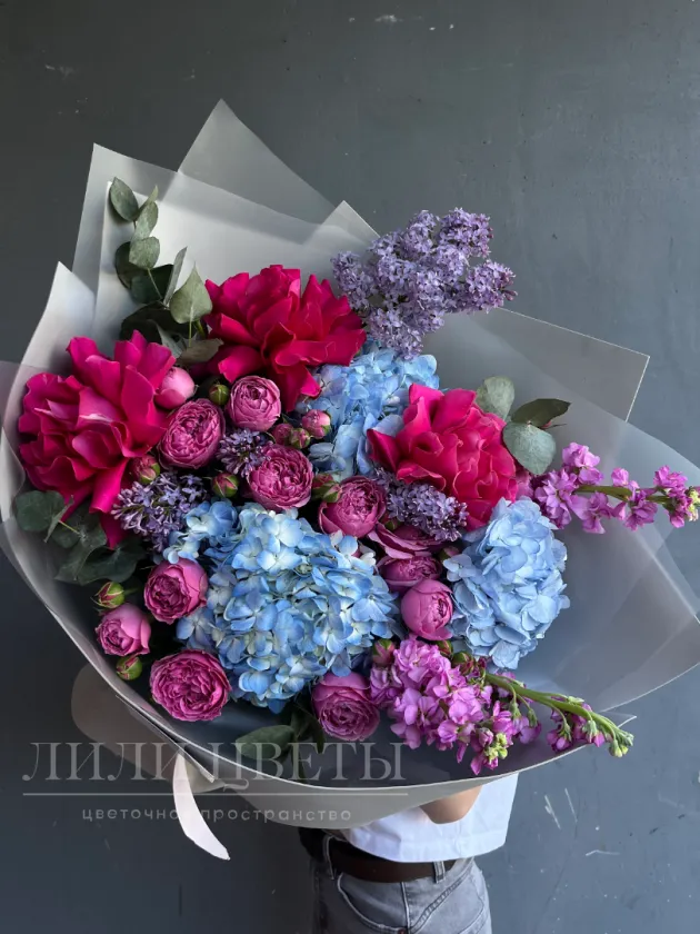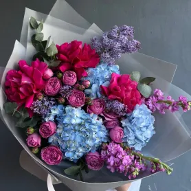 Сборный букет из гортензии, ажурных и пионовидных роз