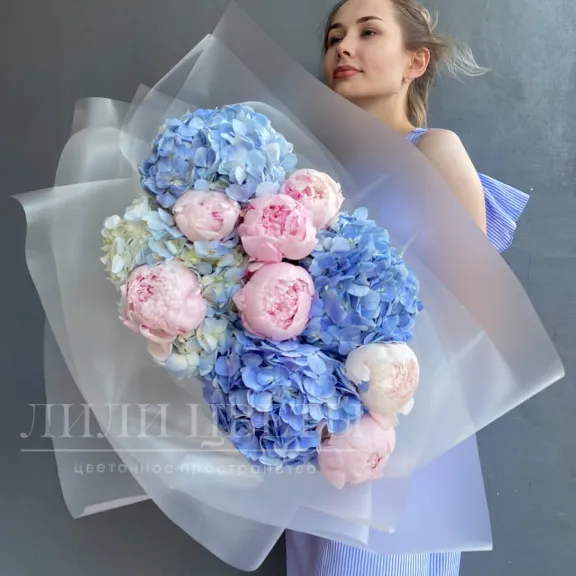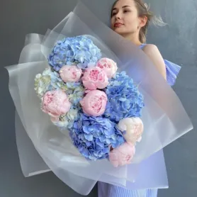 Сборный букет из пион и гортензий - это нежная композиция из двух популярных цветов, которые идеально дополняют друг друга.