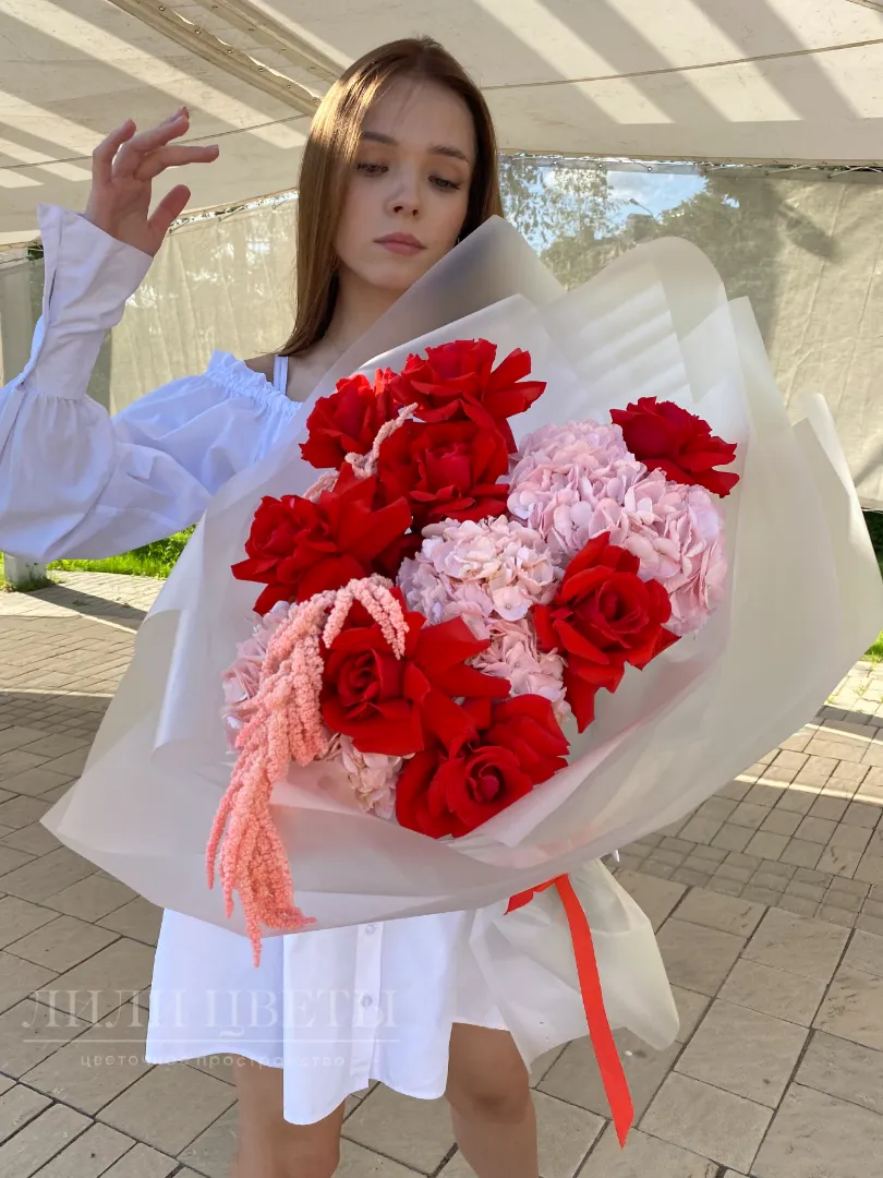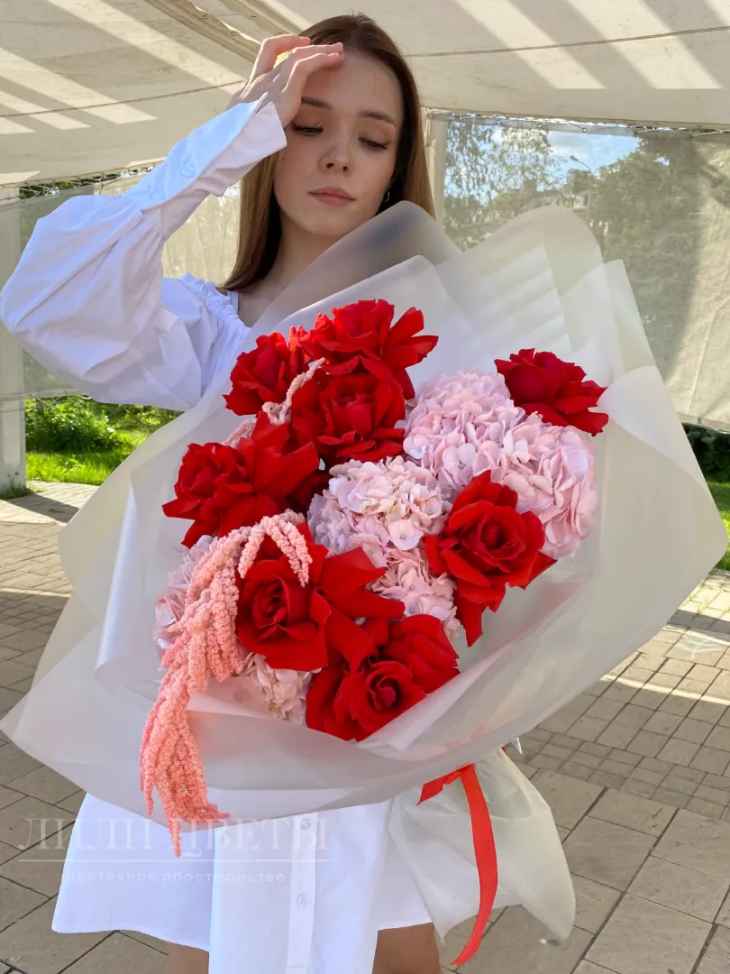 Яркие красные розы привносят яркие нотки страсти, а нежные гортензии и сухоцветы создают атмосферу нежности и романтизма.