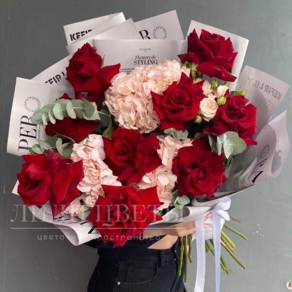 Сборный букет из гортензий, роз, кустовых роз и эвкалипта выглядит нежно и романтично.
