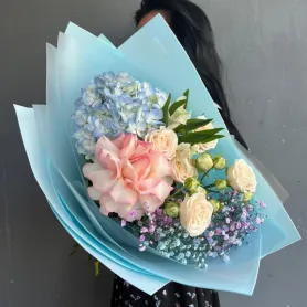 Этот сборный букет на выпускной день сочетает в себе нежность гортензии, изысканность кустовой розы, живость альстромерии и элегантность розы, а также добавляет нежное дополнение гипсофилы, создавая идеальное сочетание цветов и текстур, которое олицетворяет красоту и достижение этого особенного момента.