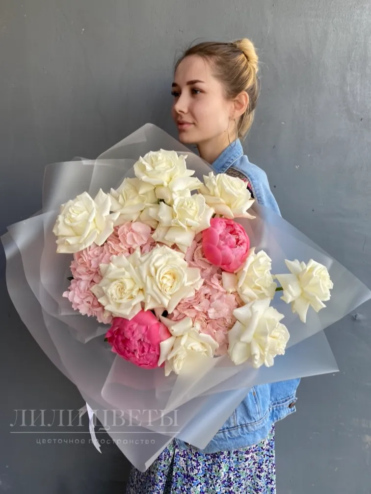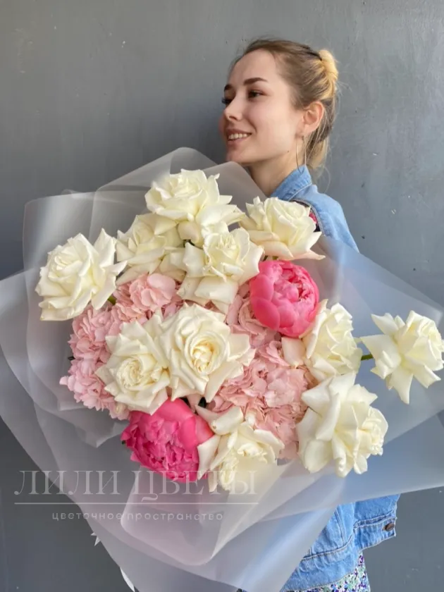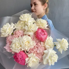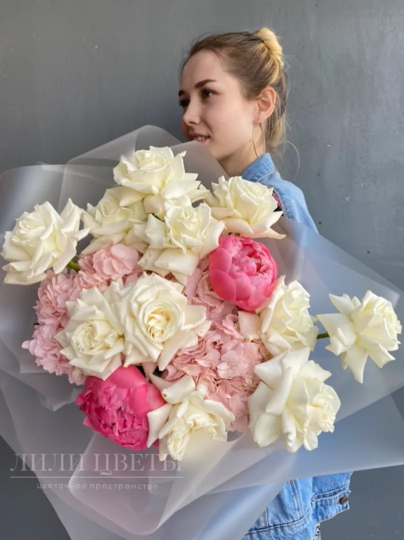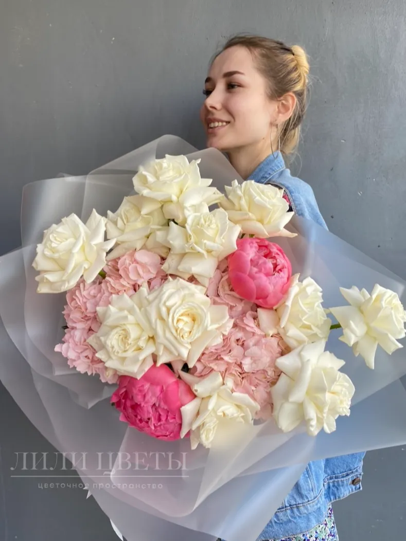 Этот прекрасный букет объединяет роскошные белые розы, нежные гортензии и пышные пионы, создавая великолепную композицию, которая олицетворяет элегантность и воздушность.