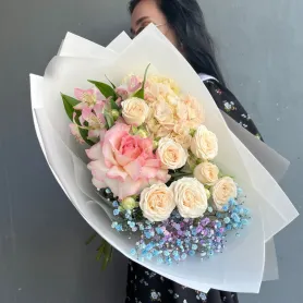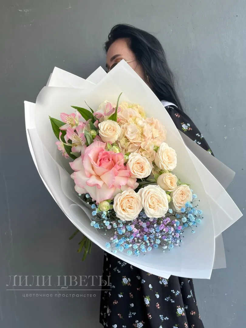 Восхитительный букет, сочетающий нежные лепестки гипсофилы, романтические розы, объемные гортензии, изящные альстромерии и красоту кустовой розы, станет прекрасным подарком к 1 сентября, наполненным теплом и нежностью для получателя.