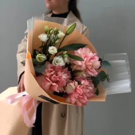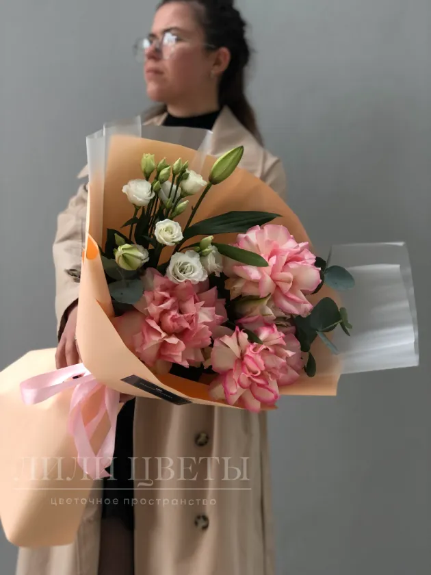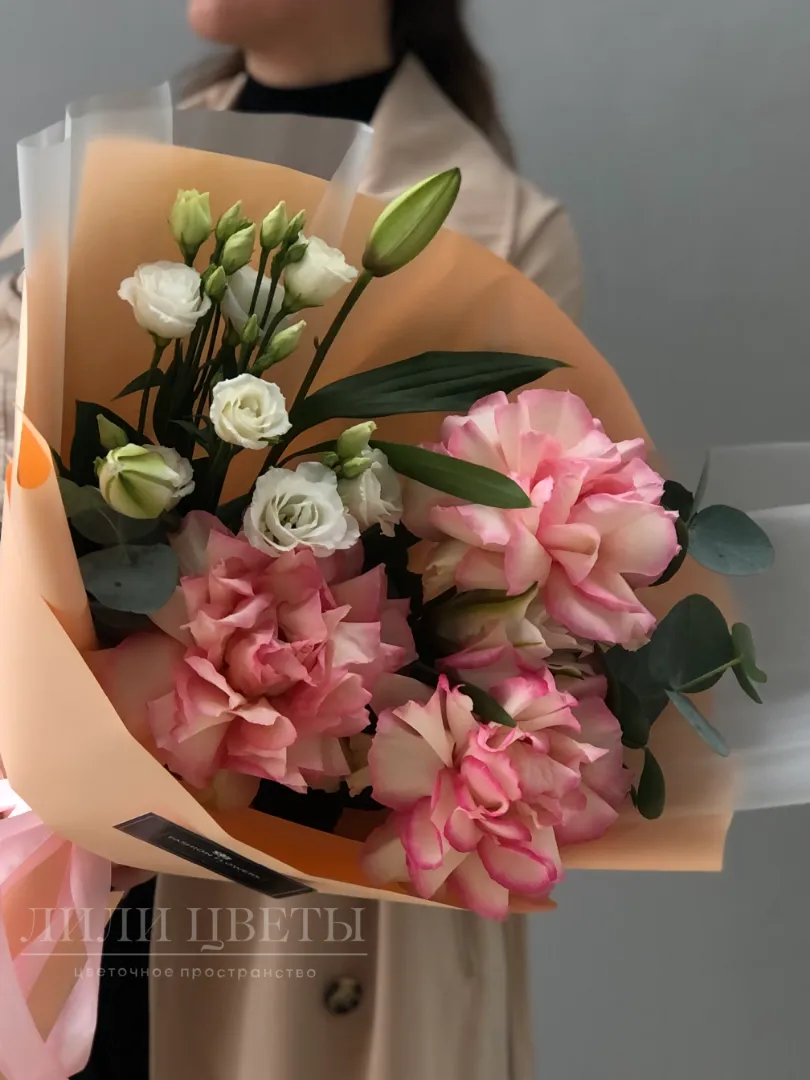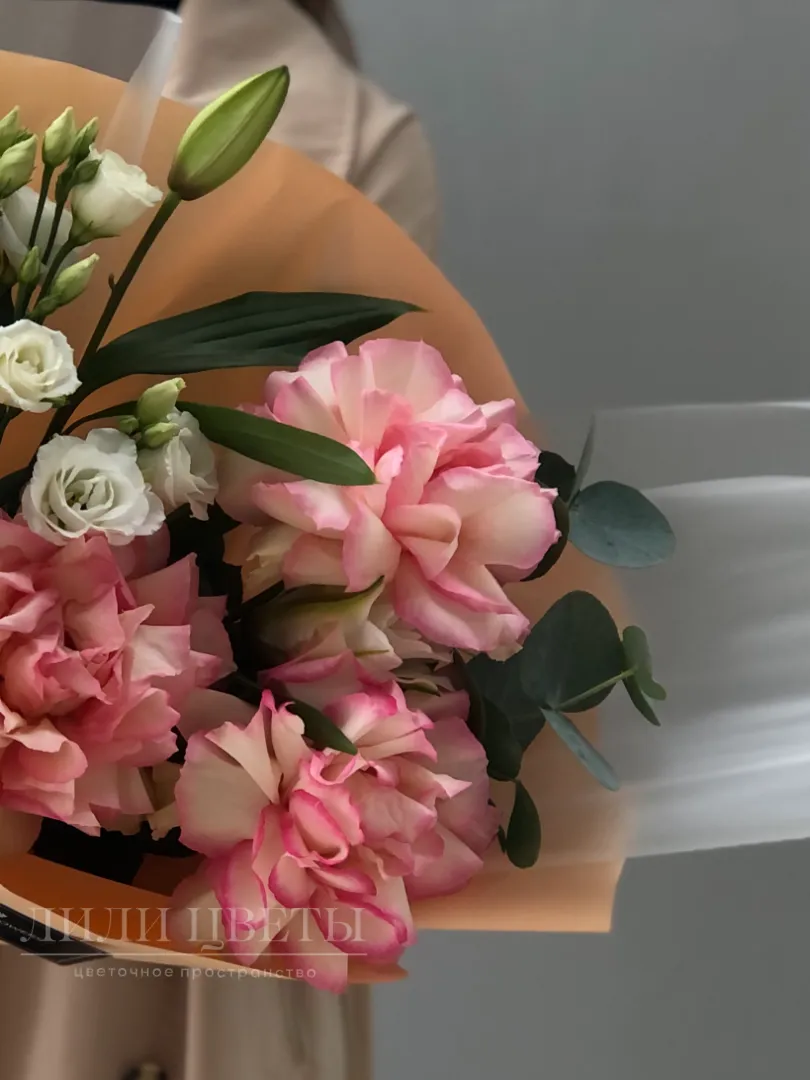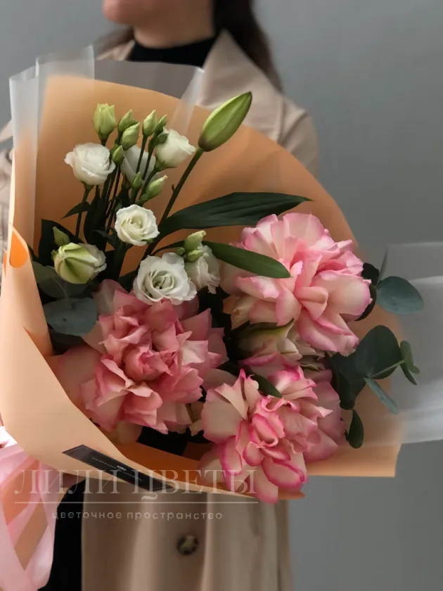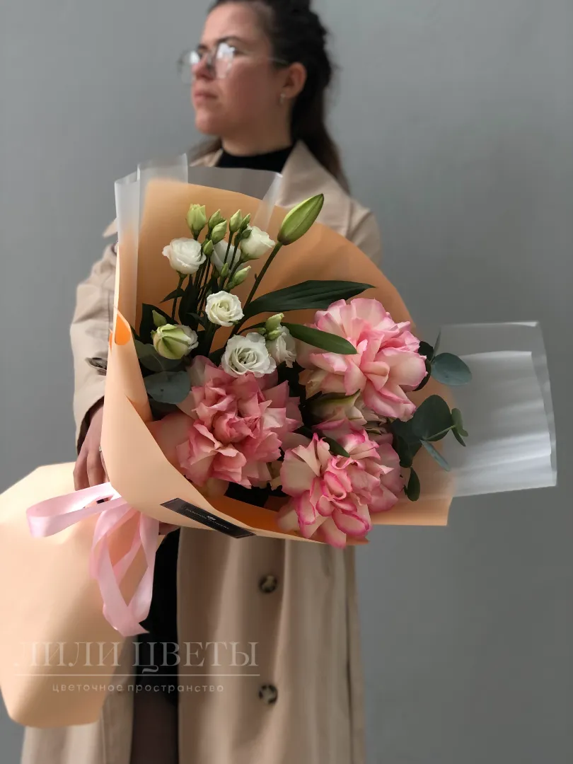 Этот изысканный сборный букет объединяет в себе нежные ажурные розы, элегантные лилии, грациозные эустомы и ароматный эвкалипт.