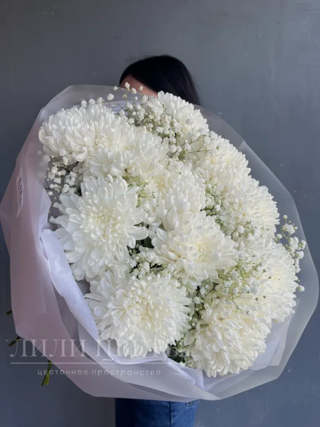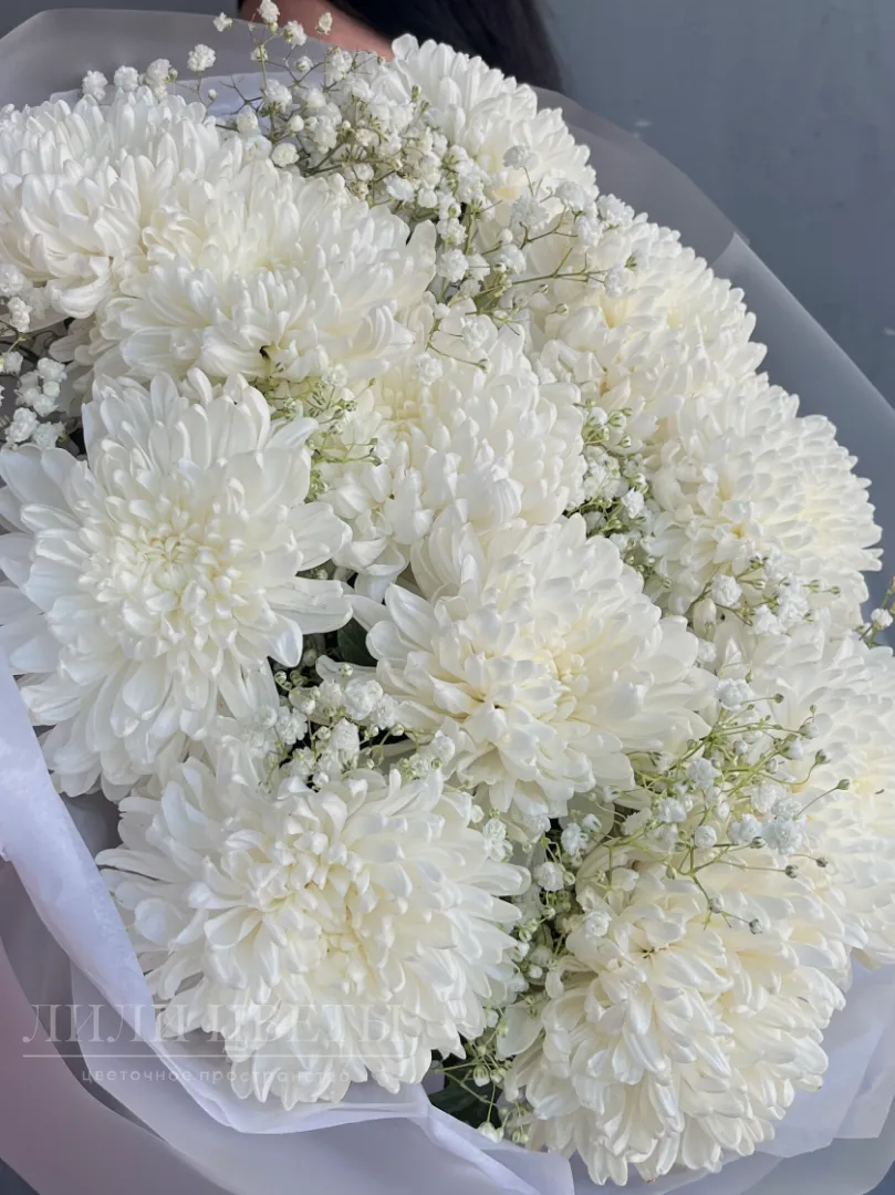 Этот утонченный сборный букет, составленный из нежных белых хризантем и легкой гипсофилы, источает атмосферу чистоты и нежности.