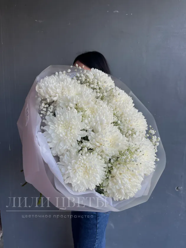 Монобукет из белых хризантем с гипсофилой