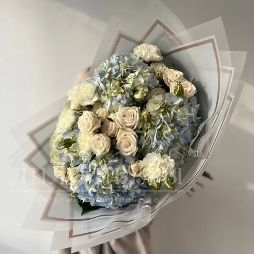 Гвоздики придадут букету элегантности и изящества, кустовые розы добавят романтичности и сладкий аромат, а гортензии подарят объем и прекрасно дополнят композицию своими крупными соцветиями.