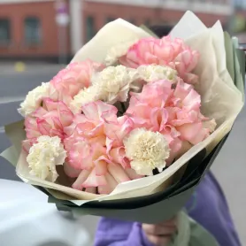 Этот великолепный сборный букет из ажурных роз и диантусов впечатляет своей нежностью и изысканностью.