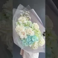 Этот восхитительный сборный букет представляет собой великолепное сочетание элегантных белых роз, нежных гортензий и изысканной ветки малины.