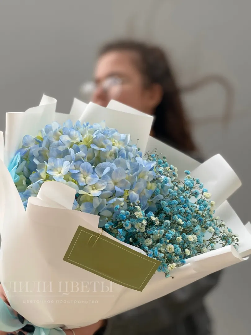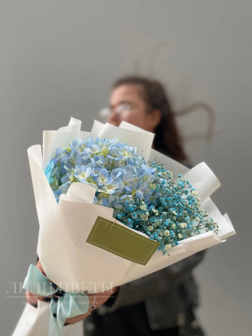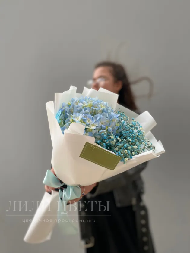 Этот изысканный сборный букет объединяет в себе нежные гортензии и воздушную гипсофилу, создавая невероятно романтическое впечатление.