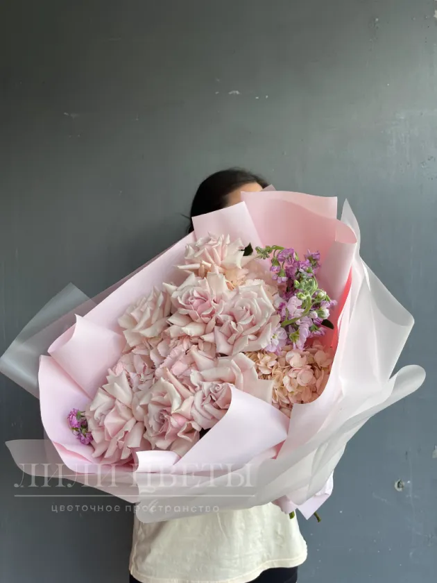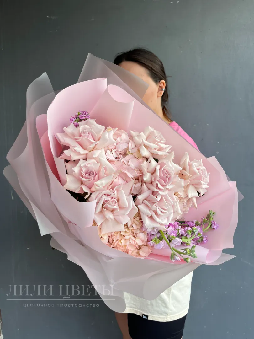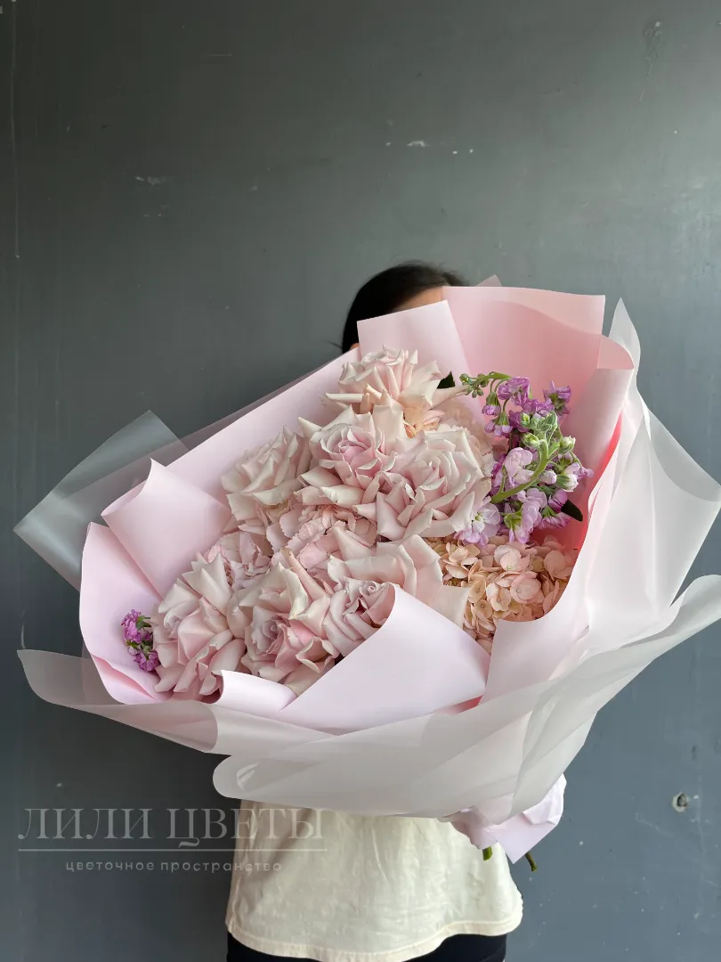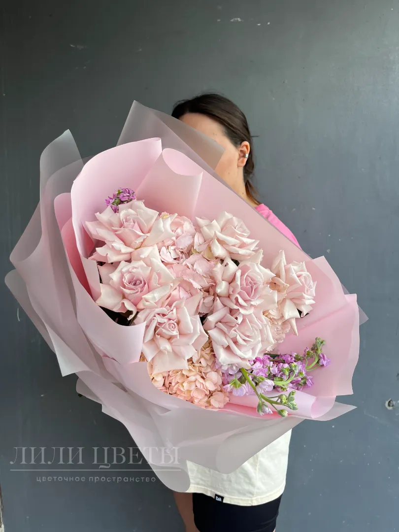 Этот изысканный сборный букет сочетает в себе красоту и нежность трех видов цветов: роз, гортензий и маттиолы.
