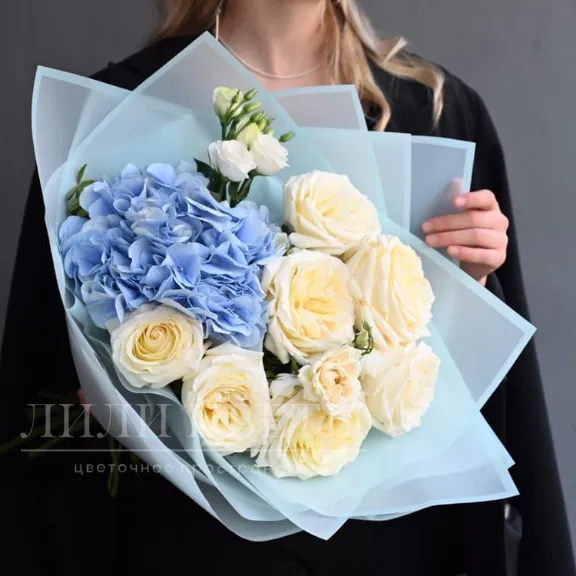 Этот сборный букет из гортензий, роз и эустомы идеально сочетает в себе нежность и изящество.