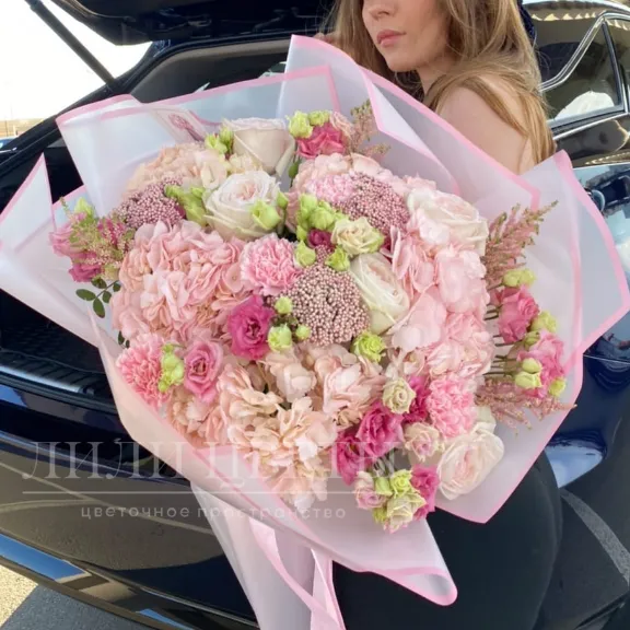 Сборный букет из гортензий, озаматуса, гвоздик, эустомы, роз, писташа и сухоцветов - это изысканный и яркий композиционный цветочный ансамбль, который привлекает внимание своей красотой и необычностью.