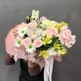 Композиция в коробке люльки на выписку из кустовых хризантем, альстромерии, кустовых роз, гвоздик, орхидей и роз — это изысканное и роскошное сочетание цветов, создающих нежную и романтическую атмосферу.