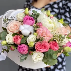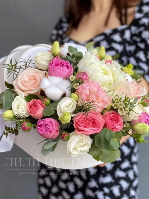 Эта нежная композиция включает в себя восхитительное сочетание пионов, кустовых роз, эвкалипта, хамелациума, эустомы и хлопка, создавая изящную и романтическую атмосферу.