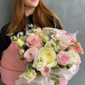 Композиция влюбляет своей нежностью и романтическим настроением, сочетая изящные розы, грациозные эустомы и ветви эвкалипта, создавая великолепную атмосферу.