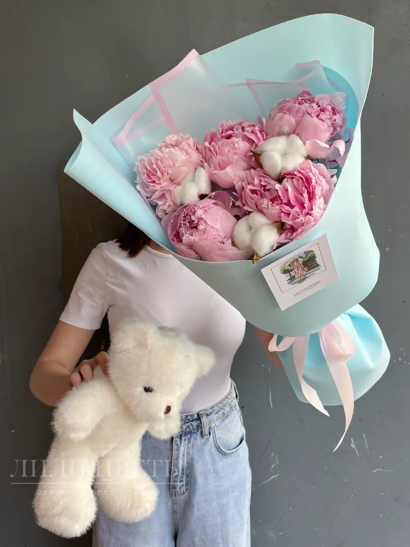 Букет из пионов и мишкой