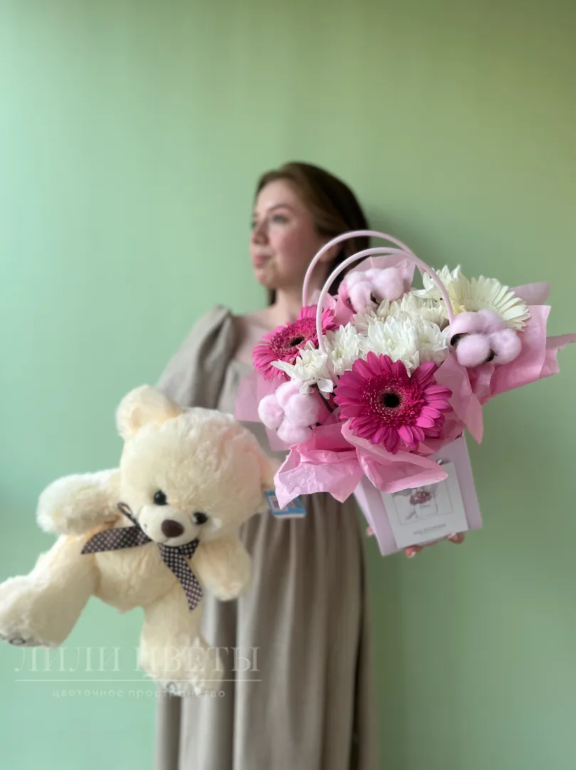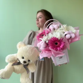 Очаровательное комбо-предложение из игрушки мишки и свежие цветы в стильной сумочке, создавая идеальный подарок для любого случая. Мишка с уютным шармом станет верным другом, а яркие цветы добавят радости и свежести. Сумочка с цветами, выполненная в современном дизайне, делает этот набор ещё более привлекательным. Такой подарок идеально подходит для выражения любви, заботы и нежности, наполняя день счастьем и теплом.