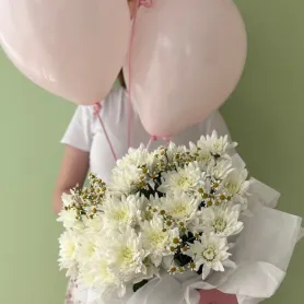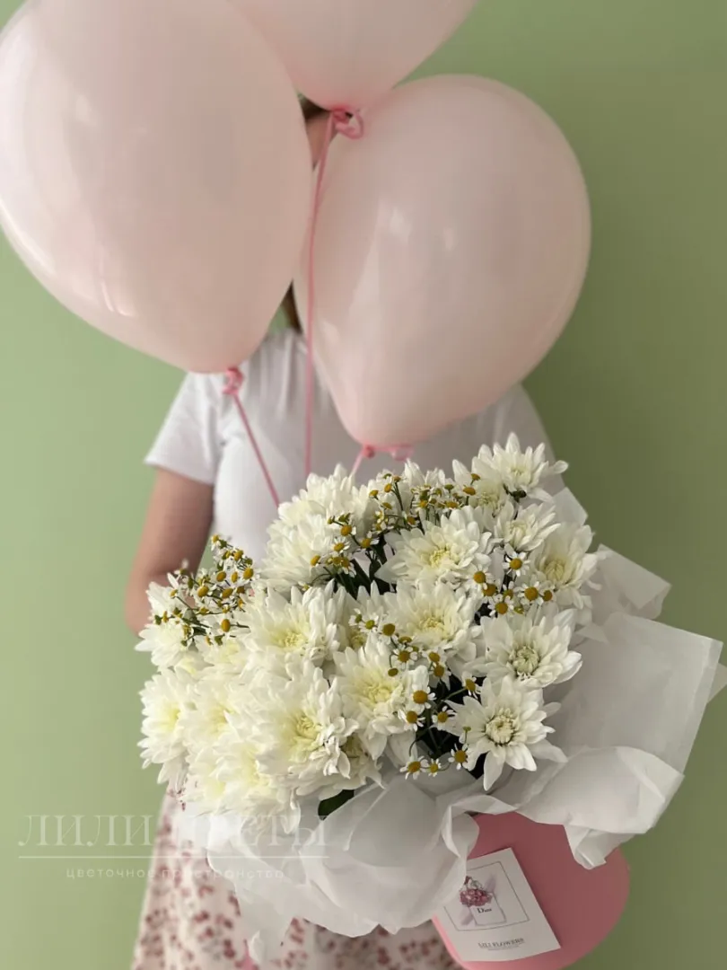 Комбо предложение из хризантем в коробочке и воздушных шариков создают эффектный акцент. Яркие шарики добавляют игривости и веселья, наполняя атмосферу радостью. Такой набор станет идеальным подарком на выписку, день рождения, юбилей или просто как знак внимания. Букет не только украсит праздник, но и станет незабываемым выражением ваших чувств, радуя глаз и поднимая настроение каждому, кто его увидит.