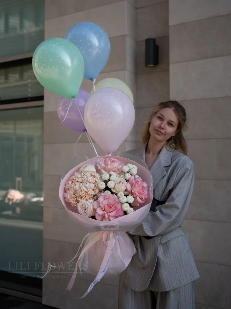 Комбо - набор идеально подойдет для дня рождения, создав незабываемые воспоминания. Удивительный подарок сочетает в себе милый букет свежих цветов и воздушные шары, создавая атмосферу праздника и радости. Букет собран из двух сортов роз, гортензии и сантини, которые мгновенно поднимают настроение и наполняют пространство свежестью. Каждый цветок в букете тщательно подобран, чтобы создать гармоничное сочетание, которое радует глаз.