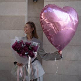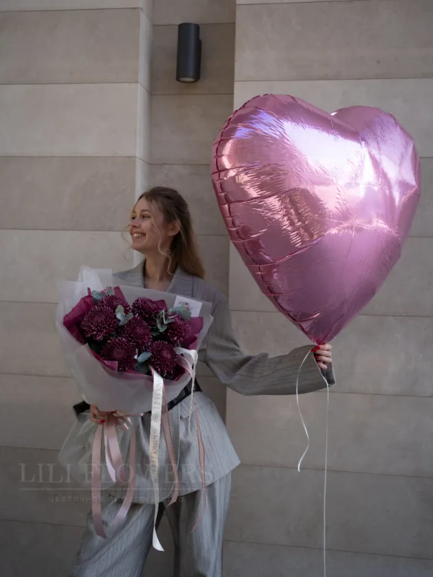 Очаровательный набор включает в себя великолепный букет свежих хризантем и большой воздушный шар. Одноголовые изысканные хризантемы наполнен яркими цветами и нежными ароматами, которые радуют глаз. Воздушный шар в виде сердца добавляет игривости и веселья, подчеркивая радостное событие. Этот набор станет идеальным подарком для любого случая, будь то день рождения, юбилей или просто желание порадовать близкого человека!