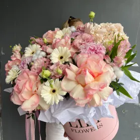 Нежная коробка с герберами, эустомой, ажурными розами и альстромерией