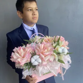 На фото – очаровательная композиция, заключенная в изящную сумочку. Нежные ажурные розы, яркие альстромерии и герберы, дополненные хлопком, создают праздничное настроение.