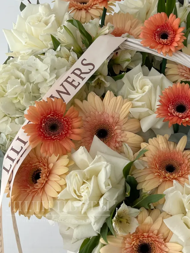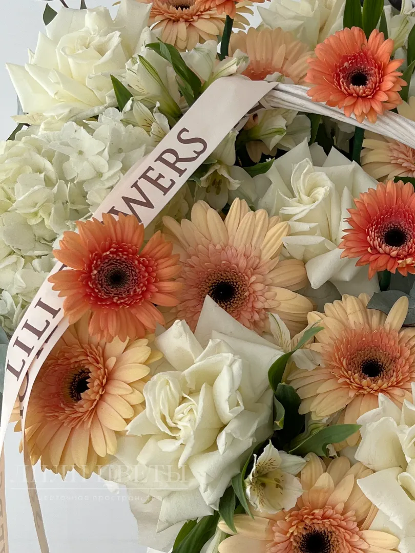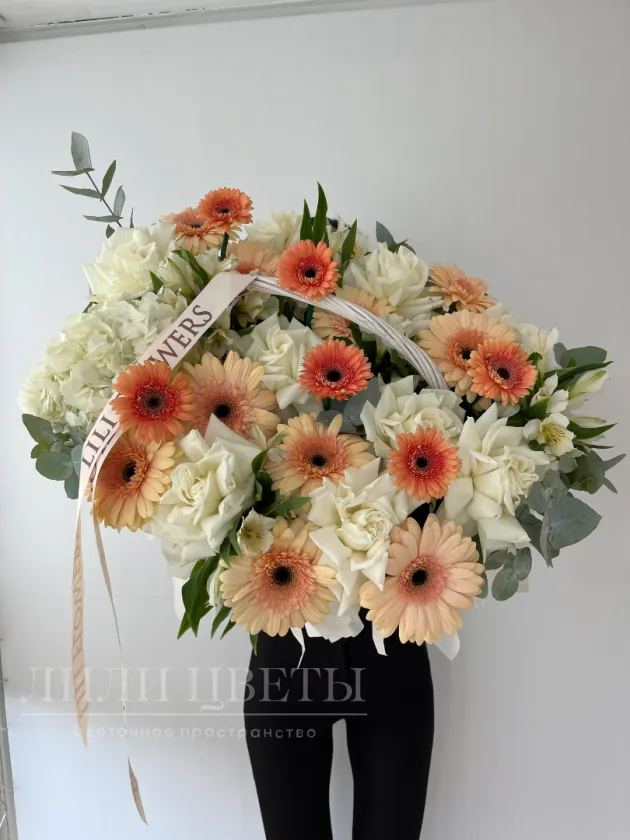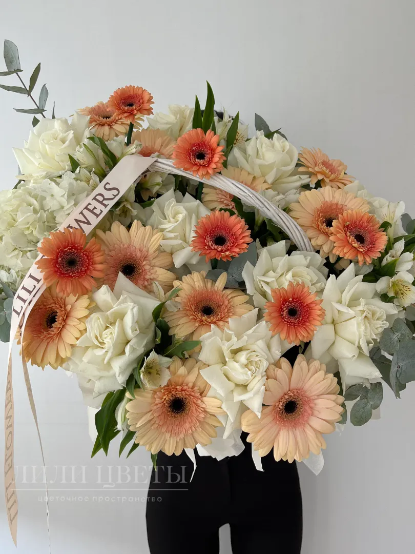 На фото - яркая и жизнерадостная композиция в корзине, наполненная солнечно-оранжевыми герберами. Их пышные лепестки, собранные в пышный букет, излучают оптимизм и радость, создавая атмосферу тепла и уюта, а корзинка добавляет композиции элегантности и практичности.