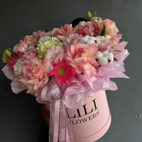 Яркая композиция в шляпной коробке с герберами