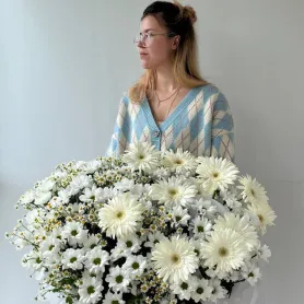 На фото - изысканная сборная композиция в белых тонах, созданная из кустовой хризантемы, гербер и танацетума. Нежные оттенки и воздушные формы цветов, объединенные в единый ансамбль, создают ощущение легкости и непринужденности, а простота форм и элегантность оформления делают композицию идеальным дополнением к любому интерьеру.