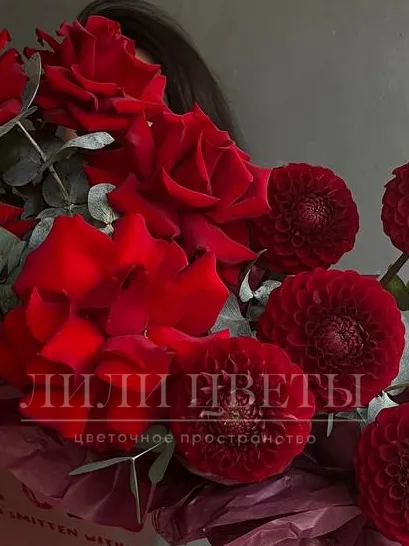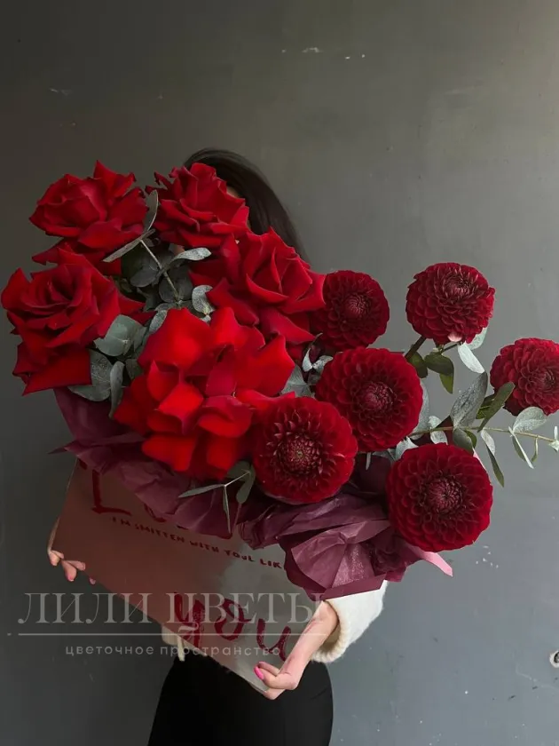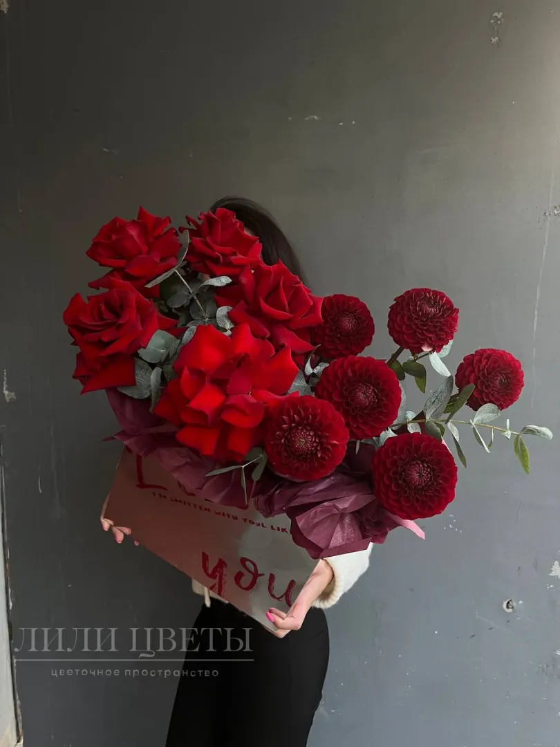 На фото - роскошная композиция в крафтовой коробке, где красные ажурные розы и георгины создают яркий и эффектный ансамбль. Сочные оттенки и пышные формы цветов придают композиции страстность и эмоциональность, делая ее идеальным подарком для любимого человека или украшением торжественного мероприятия.