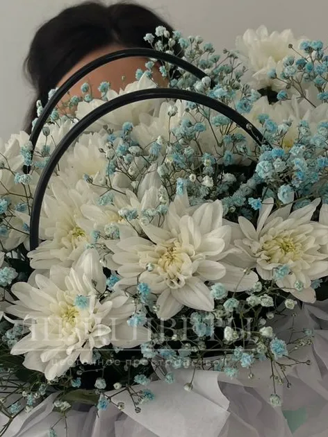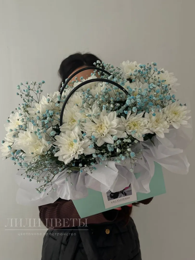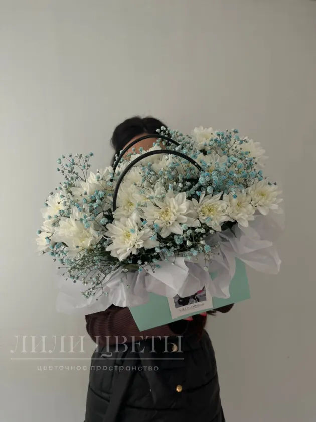 Композиция в сумочке из кустовой хризантемы и голубой гипсофилы