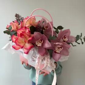 Композиция в сумочке из ажурных роз и розовых орхидей