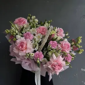 Сборная корзина с ажурными розами, эустомой, альстромерией, диантусов